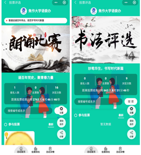 (一)普通話迎百年黨慶,赤子心傳紅色基因。開展“誦百年黨史,聚青春力量”推廣普通話朗讀比賽。學生可通過微信小程序“投票評選工具”上傳作品進行參賽,小程序網絡評選按票數,分一、二、三等獎(分別設:1名、3名、5名)。本次比賽的評比,旨在朗讀比賽中體現出焦大學子說好普通話的自覺;展現出焦大學子良好的精神狀態;表現出焦大學子飛揚的青春風采。