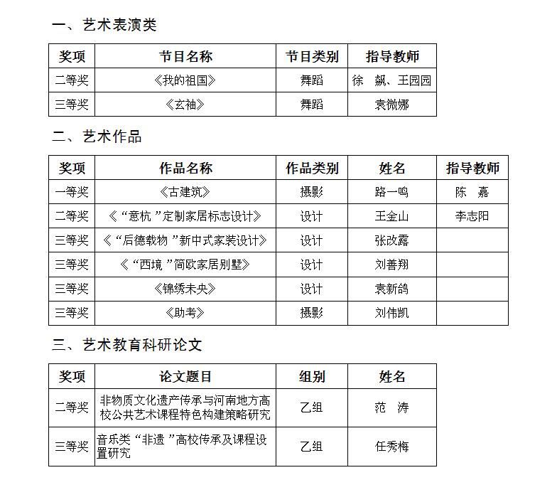 附:我校師生參加河南省第五屆大學生藝術展演活動獲獎名單