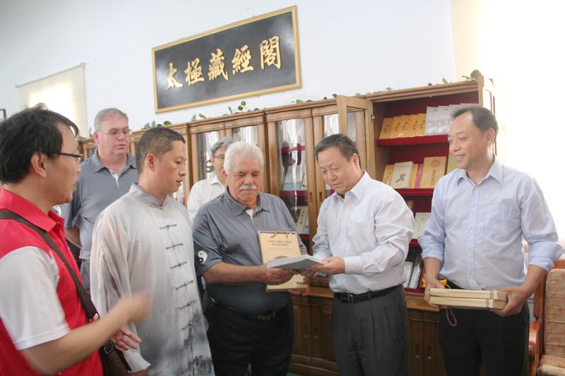 校長(zhǎng)鄭廣華代表焦作大學(xué)向外賓贈(zèng)送了由我校教師任天麟編著的太極拳教材。