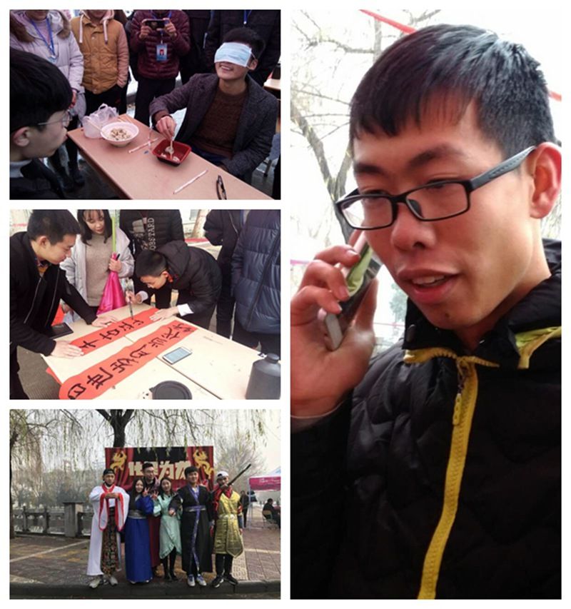 本次活動以傳統節日為主線,貫穿游戲始終。元宵節猜燈謎、鬧元宵;端午節吃粽猜味、賽龍舟;中秋節趣味吃月餅;重陽節感恩孝老;春節寫春聯、合作吃餃;重溫中國傳統文化創意賽。雖然下著淅淅瀝瀝的小雨,但同學們參加活動的熱情始終未減。活動中大家有的耐心思考著燈謎,有的小心翼翼的夾著“元宵”移向勝利的終點,有的品嘗棕味體會著人生的酸甜苦辣,有的在指壓板上痛并快樂著,有的沉浸在書法的意境中,有的在相互配合吃餃子中感受著年味,有的穿越到歷史長河中演繹著古人的傳奇故事。尤其在以“濃情久久,感恩孝老”為主題的重陽節里,同學們紛紛拿出手機給父母撥通了電話。他們真情流露,臉上一會兒洋溢著幸福的微笑,一會兒呈現出親情的溫馨,一會兒又流露出內心的愧疚。一個電話,一份感恩;一個電話,一份親情。他們向父母說出了埋藏在心底許多年未曾表達的心里話“媽媽爸爸,你們辛苦了,我愛你們!”。
