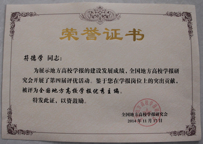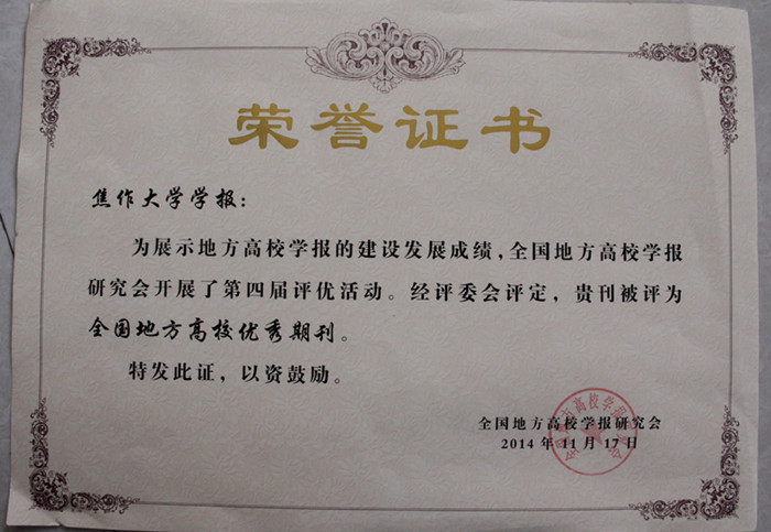 《焦作大學學報》2006年在獲得河南省新聞出版局通報表揚以來,“懷川文化研究”專欄2010年又獲得國家級特色欄目。近年來,為了展示地方高校學報的建設發展成績,2014年全國地方高校學報研究會開展了第四屆評優活動。在本次評選中,《焦作大學學報》再次獲得了驕人佳績:學報被評為“全國地方高校優秀期刊”,主編、副校長符德學被評為“全國地方高校學報優秀主編”。編輯部工作連續實現了不斷提升,標志著我校學報工作跨入了全國地方高校辦刊先進行列。