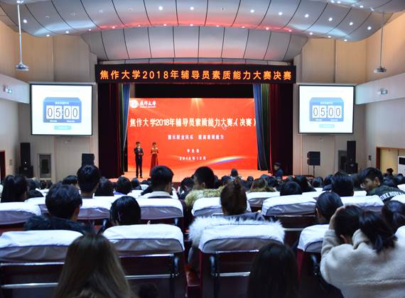 為深入學(xué)習(xí)貫徹習(xí)近平新時(shí)代中國(guó)特色社會(huì)主義思想和黨的十九大精神,全面貫徹落實(shí)全國(guó)高校思想政治工作會(huì)議和全國(guó)教育大會(huì)精神,進(jìn)一步提升我校輔導(dǎo)員隊(duì)伍素質(zhì)能力,學(xué)生處于12月14日在南校區(qū)報(bào)告廳舉辦焦作大學(xué)2018年輔導(dǎo)員素質(zhì)能力大賽決賽。校黨委書記魏曰高、副校長(zhǎng)符德學(xué)出席并現(xiàn)場(chǎng)觀摩了比賽;學(xué)生處處長(zhǎng)、各學(xué)院黨總支書記、主管學(xué)生工作副院長(zhǎng)、學(xué)工辦主任、專兼職輔導(dǎo)員和學(xué)生代表觀摩了比賽。團(tuán)委書記張繼文、招生就業(yè)處處長(zhǎng)張永強(qiáng)、教務(wù)處副處長(zhǎng)張宏、學(xué)生處副處長(zhǎng)楊紅、法律與政治學(xué)院教授王明英、心理咨詢中心主任周永平、學(xué)生處學(xué)籍管理科科長(zhǎng)王凱擔(dān)任本次決賽評(píng)委。