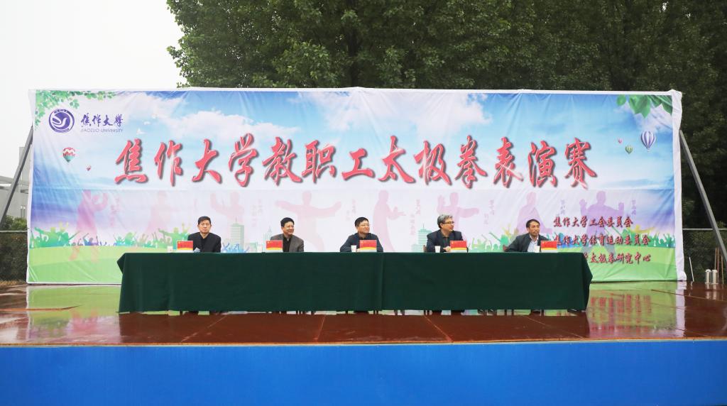 2019年4月22日下午,伴隨著溫暖的春風和綿綿的春雨,迎來了焦作大學第三屆教職工太極拳表演賽。校黨委書記魏曰高、黨委副書記、工會主席符德學、校紀委書記劉際平、副校長吳玉倫、副校長秦海金出席表演賽開幕式。黨委副書記、工會主席符德學致開幕詞,黨委書記魏曰高宣布焦作大學教職工第三屆太極拳表演賽開始。