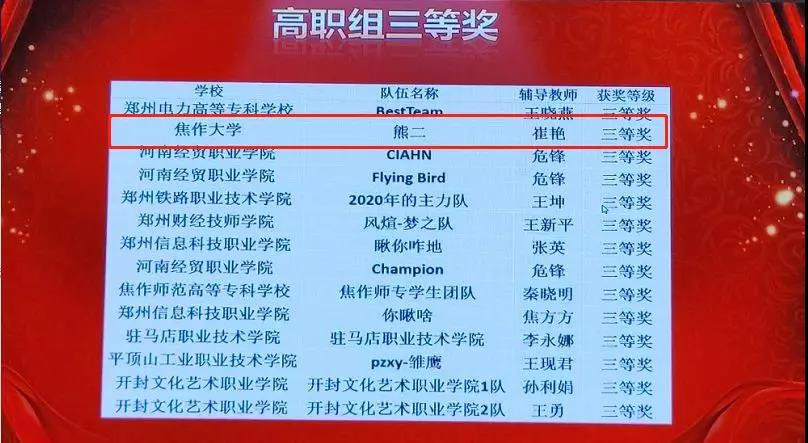 本次大賽由“線上個人挑戰賽”和“線下分組對抗賽”兩個階段的競賽組成。經過精心籌備、選拔培養,我校信息工程學院派出3個學生參賽隊共計9人參加了本次線下賽。經過激烈角逐,李森森、劉佳、將港帥組成的木聯星隊和劉柄利、吳牧原、楊家偉組成的飛虎隊均獲得二等獎邱新濤、馮順、毛利寬組成的熊二隊獲得三等獎。另外,呂麗萍、趙杰文、崔艷老師獲得優秀指導教師獎。參賽成績優異,我校被教育廳授予優秀組織獎(共授予20所高校)。