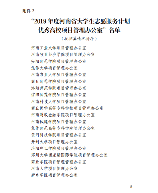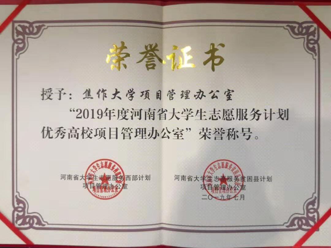 近日,河南省大學生志愿服務西部計劃項目管理辦公室、河南省大學生志愿服務貧困縣計劃項目管理辦公室下發了《關于表彰2019年度河南省大學生志愿服務計劃優秀項目管理辦公室和服務期滿優秀志愿者的決定》(豫項辦字〔2019〕8 號)的通知,我校團委被評為“2019年度河南省大學生志愿服務計劃優秀高校項目管理辦公室”,全省共有20個高校獲此殊榮,我校排名第四。