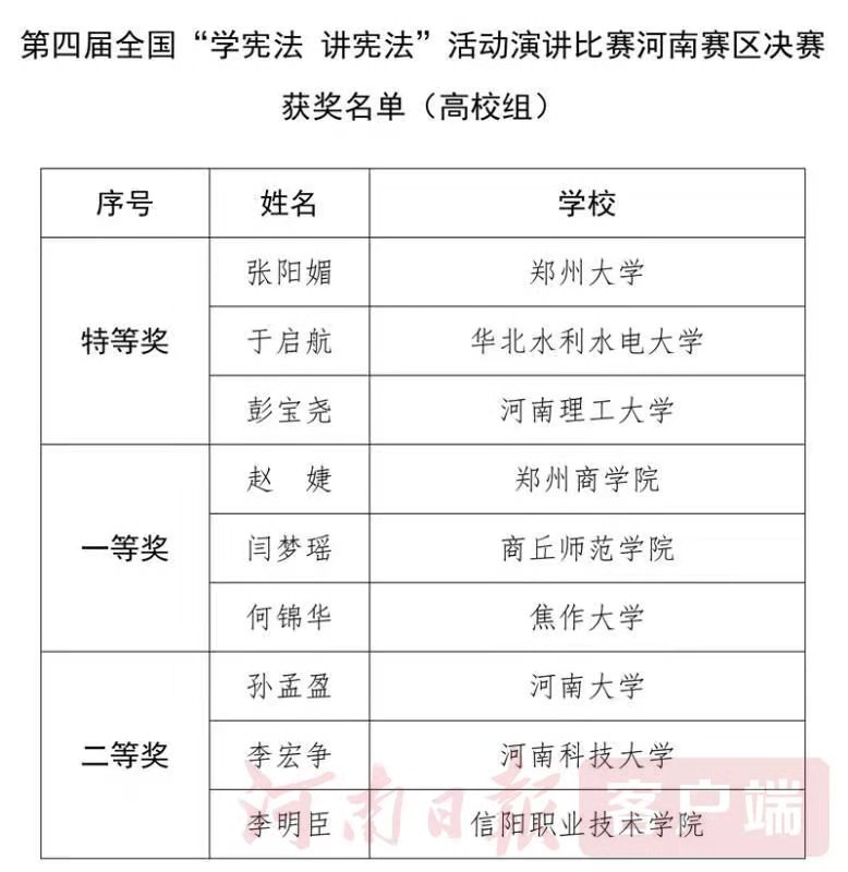 今年6月以來,河南省教育廳組織開展了第四屆全省學生“學憲法 講憲法”活動,以“弘揚憲法精神 禮贊我的祖國”為主題,此次活動分為演講比賽和知識競賽兩項賽事,分別設置小學組、初中組、高中組(含中職)和高校組四個組別。前期經過各地市、各學校精心組織,層層選拔,最終117名選手參加省級決賽?! ?/span>