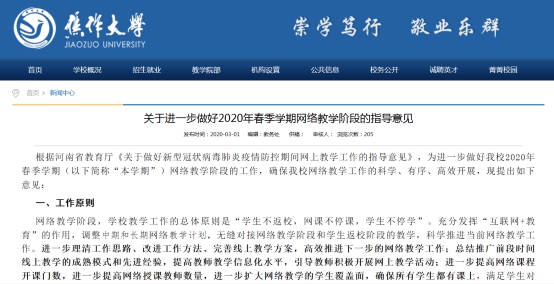 面對肺炎疫情這個“契機”,學校教務部門將以此為“教材”,從災難中探索互聯網教育的新思維,保障線上教學“增質不減量、升標不降準”,進一步創新線上教學管理新機制,把新冠肺炎疫情防控期間的教學工作落到實處。