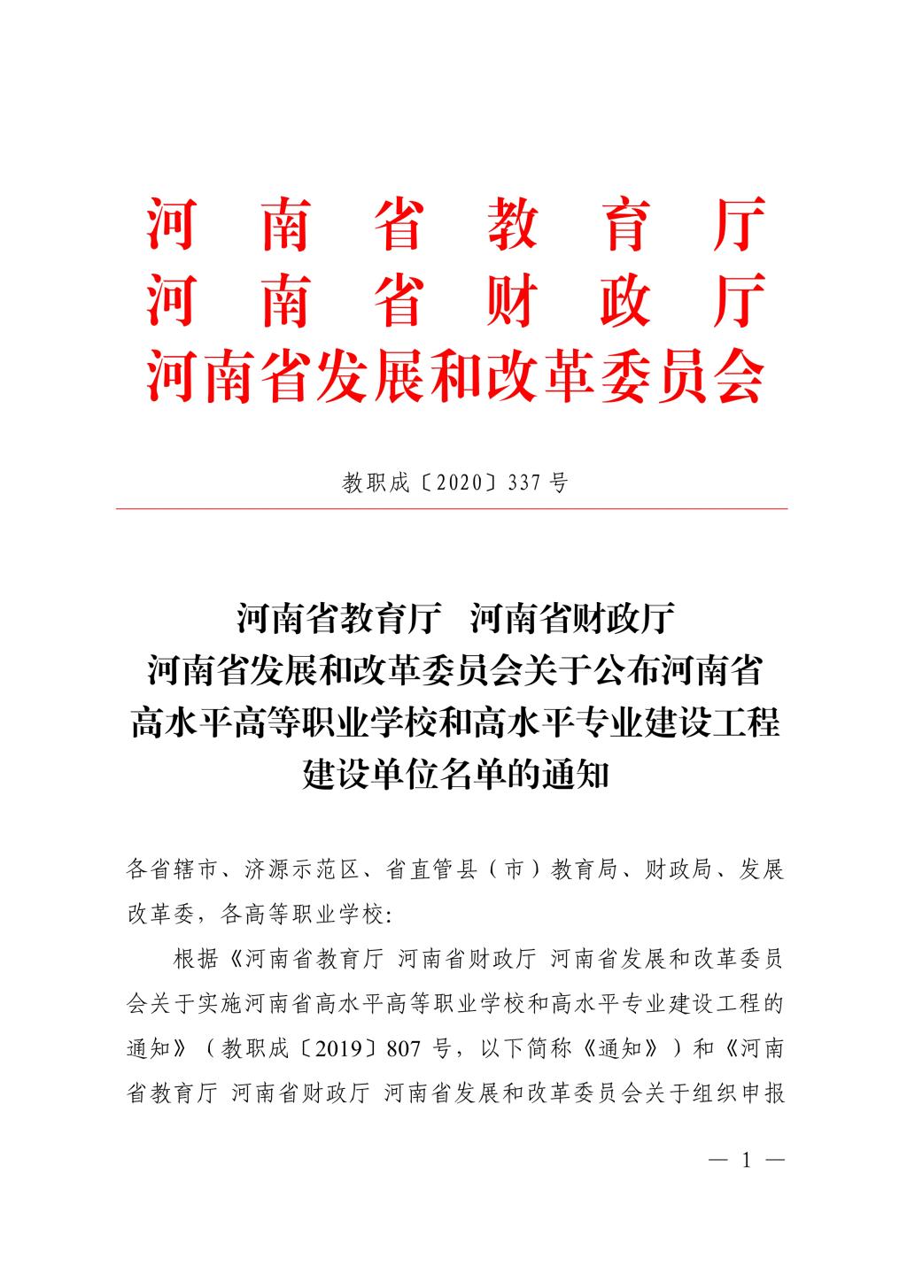 近日,河南省教育廳、河南省財政廳、河南省發展和改革委員會正式公布河南省高水平高等職業學校和高水平專業建設工程(以下簡稱“高職雙高工程”)建設單位名單(教職成〔2020〕337 號),我校成功入選河南省高水平高等職業學校和高水平專業建設工程建設單位。