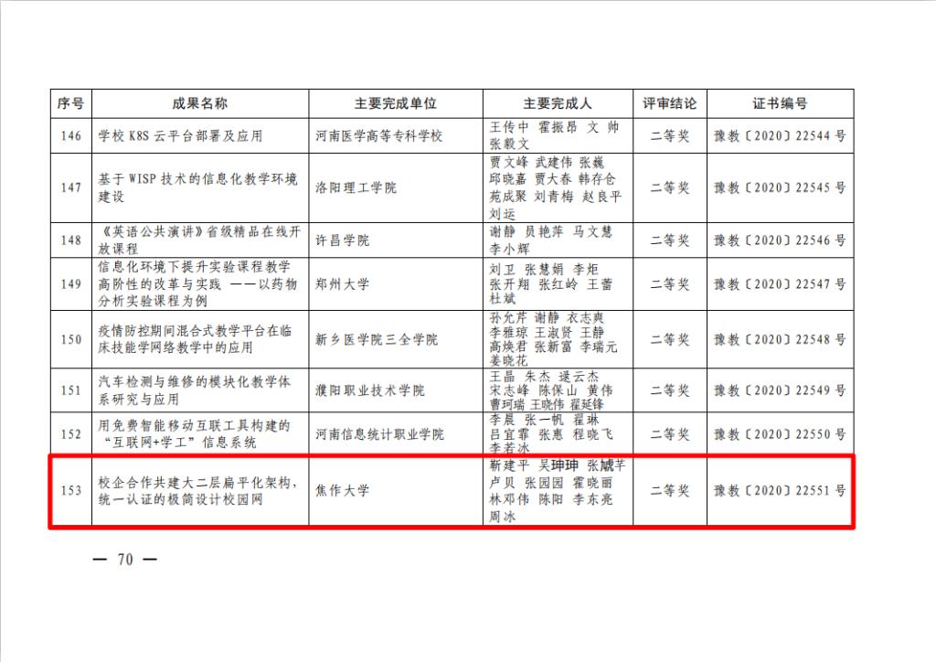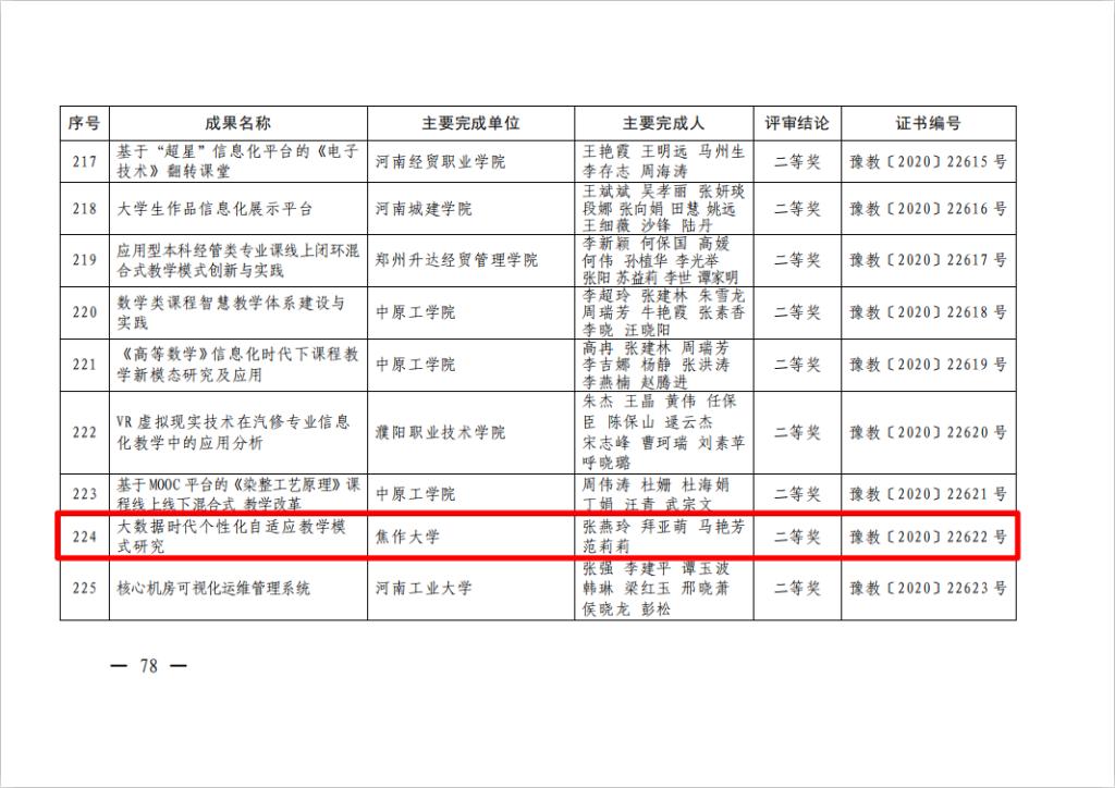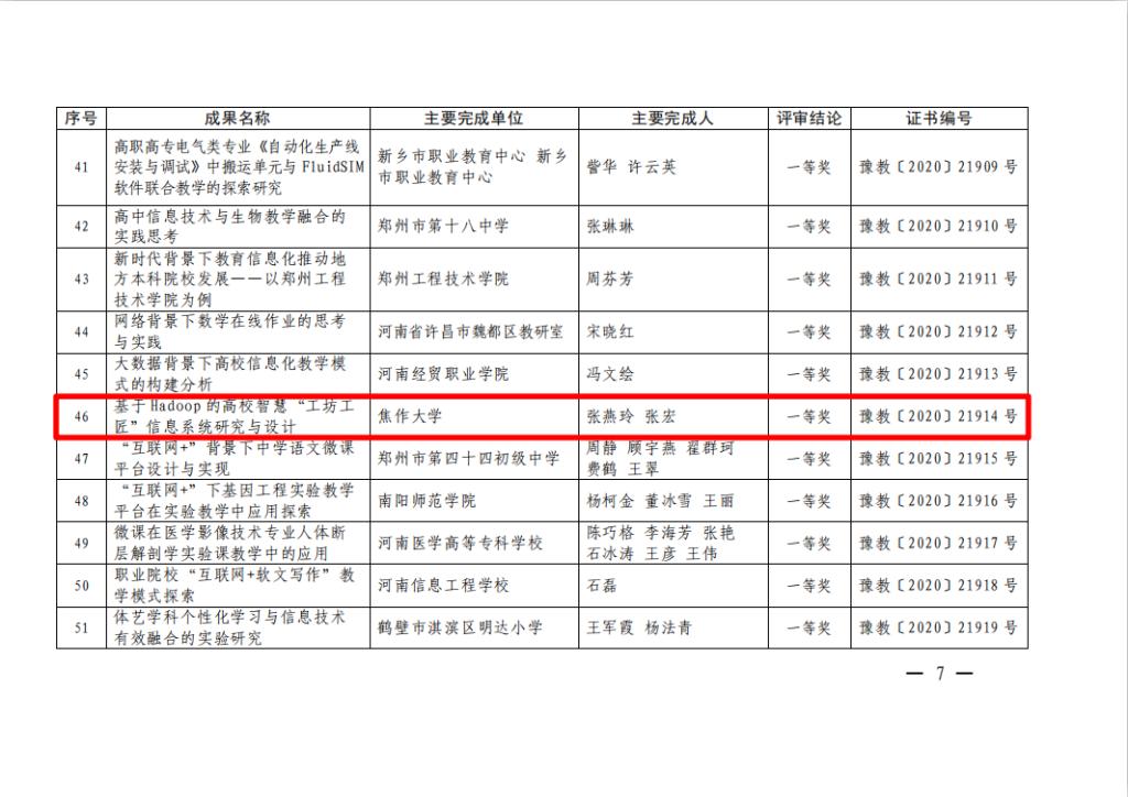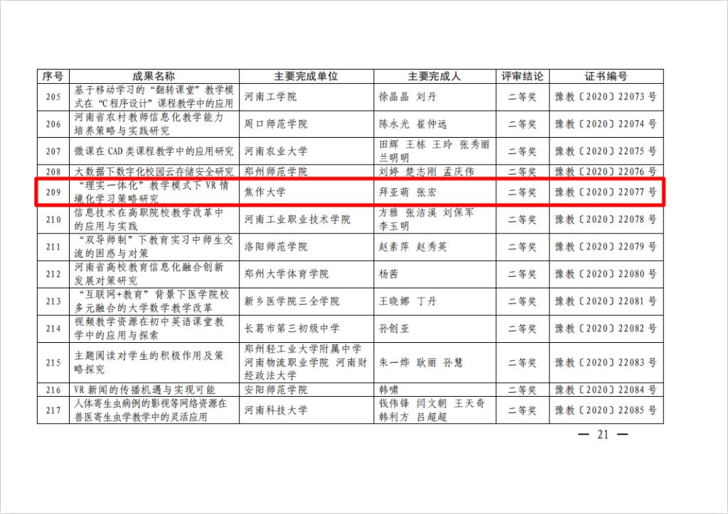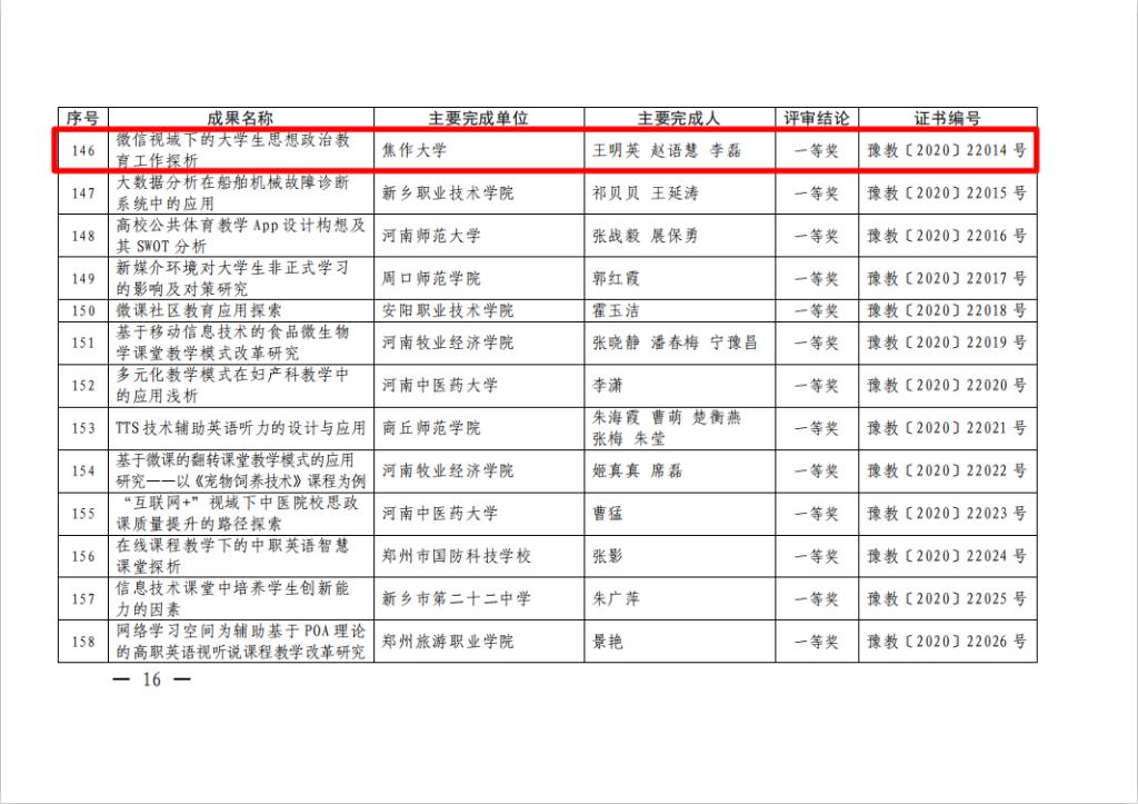 近日,河南省教育廳下發了《關于公布2020年度河南省教育信息化優秀成果獎獲獎名單的通知》(教科技〔2020〕332號),對2020年度河南省教育信息化優秀成果獎獲獎名單予以公布,我校多位教師論文及作品獲獎。其中,理論研究類成果(論文類)獲得一等獎三個、二等獎兩個;創新應用類成果(高等院校及職業院校)一等獎一個,二等獎三個;優秀教育電視節目類,校園電視作品二等獎三個。獲獎名單如下: