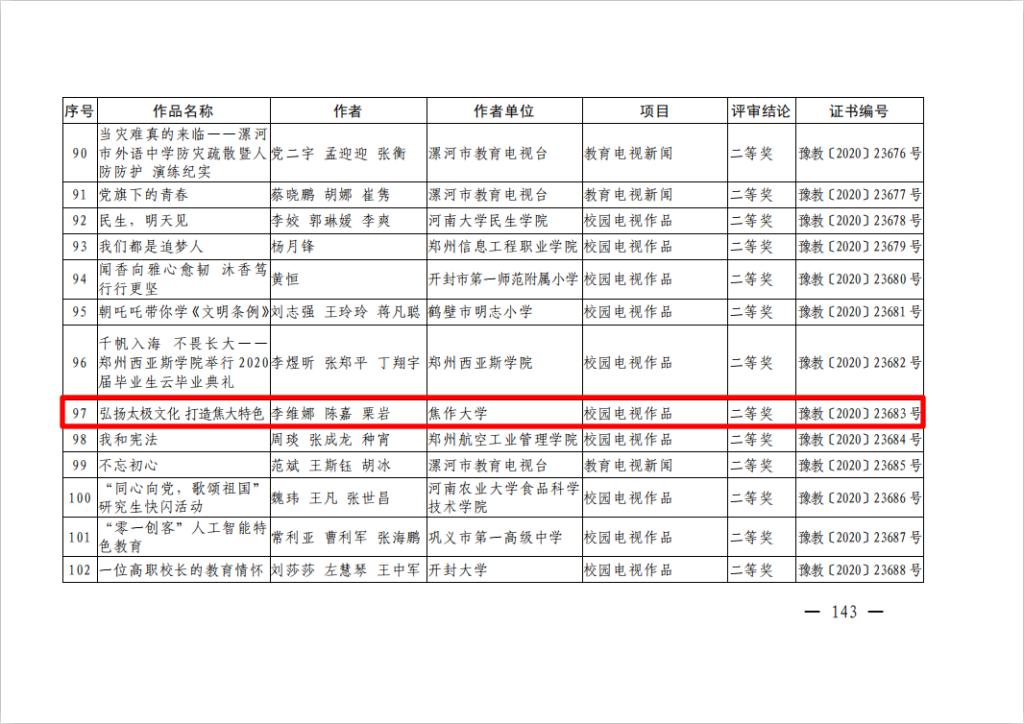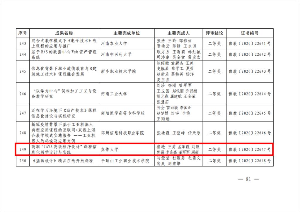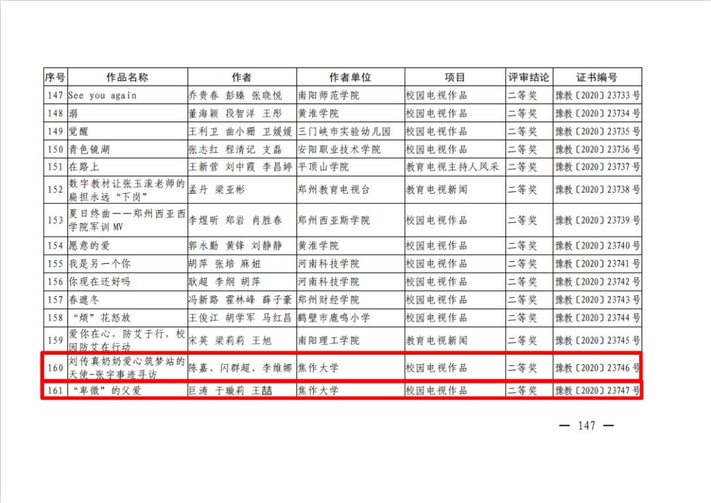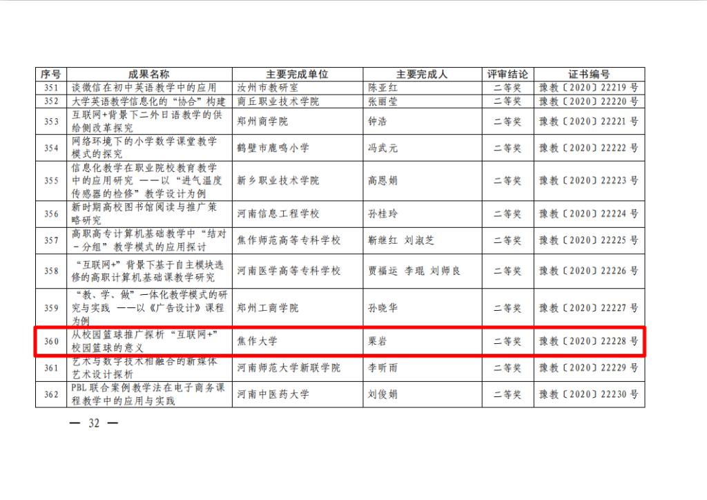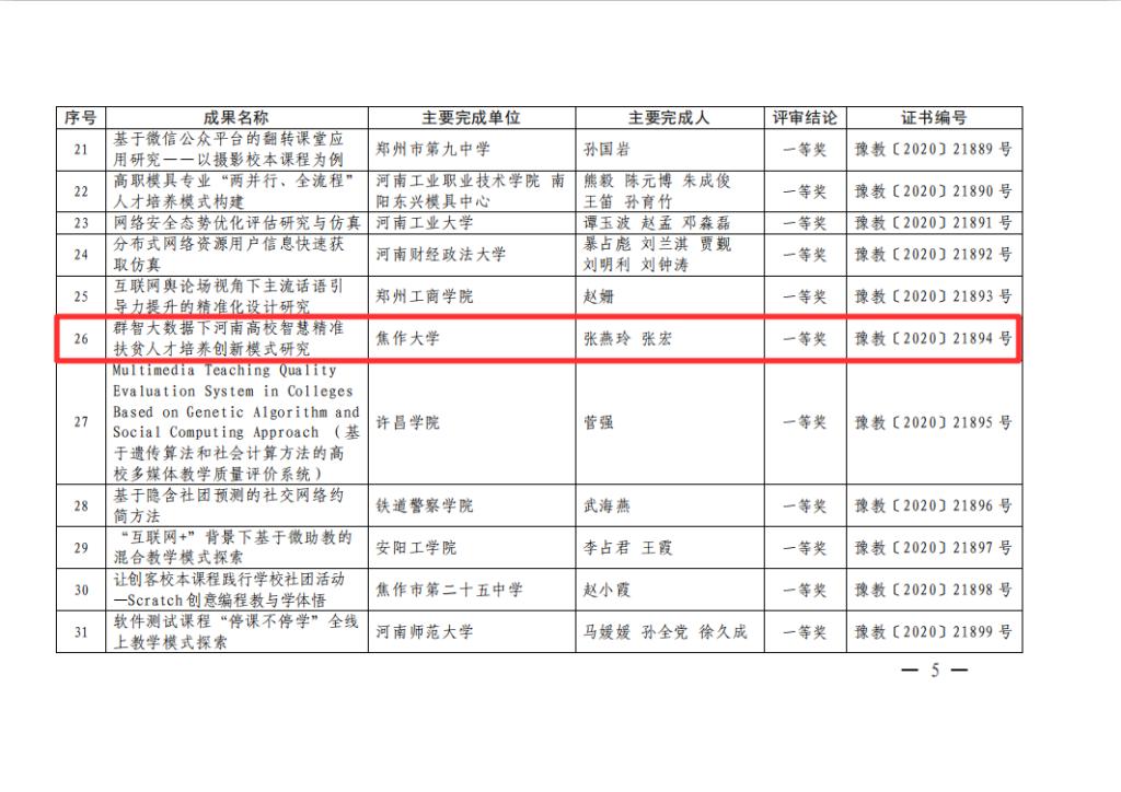 近日,河南省教育廳下發了《關于公布2020年度河南省教育信息化優秀成果獎獲獎名單的通知》(教科技〔2020〕332號),對2020年度河南省教育信息化優秀成果獎獲獎名單予以公布,我校多位教師論文及作品獲獎。其中,理論研究類成果(論文類)獲得一等獎三個、二等獎兩個;創新應用類成果(高等院校及職業院校)一等獎一個,二等獎三個;優秀教育電視節目類,校園電視作品二等獎三個。獲獎名單如下: