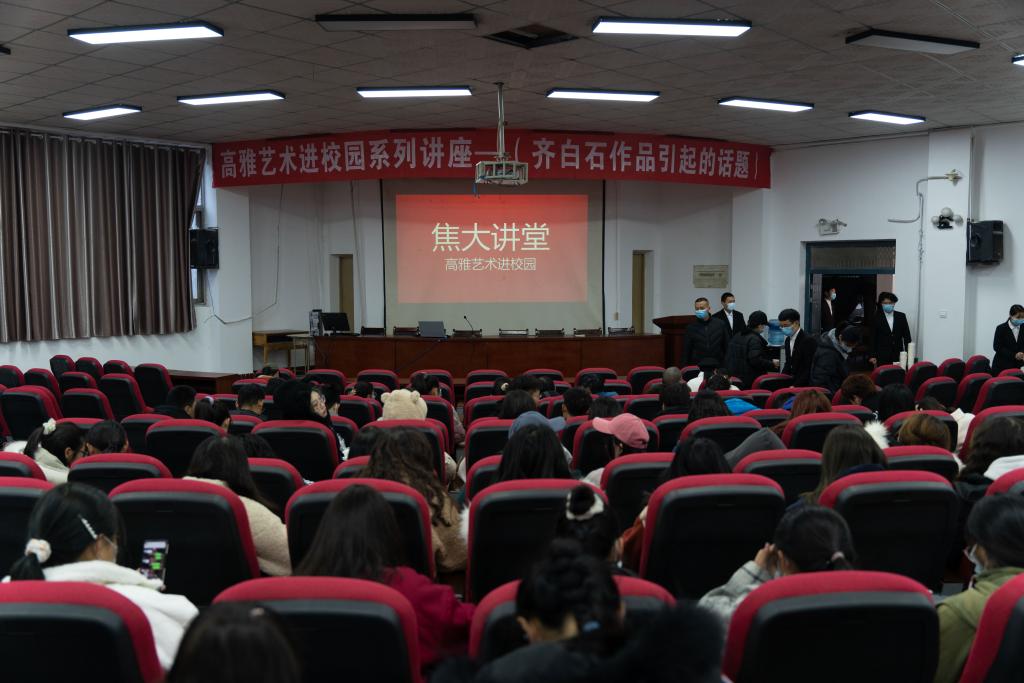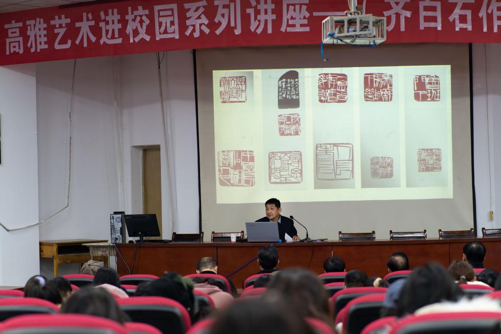 謝小毛先生以“齊白石作品引起的話題”為主題,從齊白石作品到底好在哪里、如何看待當前極度西化的中國畫創作、齊白石對后代藝術家的影響等三個方面詳細介紹了齊白石先生書畫、篆刻作品的精髓之處,以及齊白石對后世影響。謝小毛先生通過獨特的學術角度和口語化的語言,讓更多的人認識了解齊白石和他的作品,帶領現場師生共同感受了傳統文化的魅力,共同體會文化自信的豐富內涵。