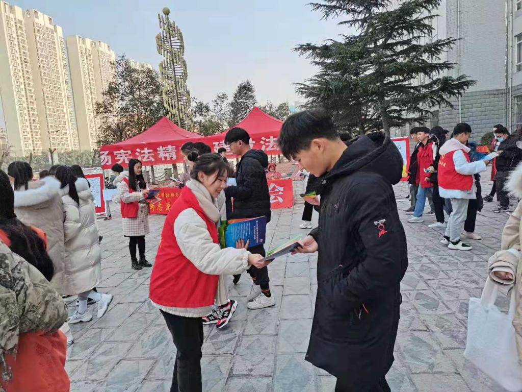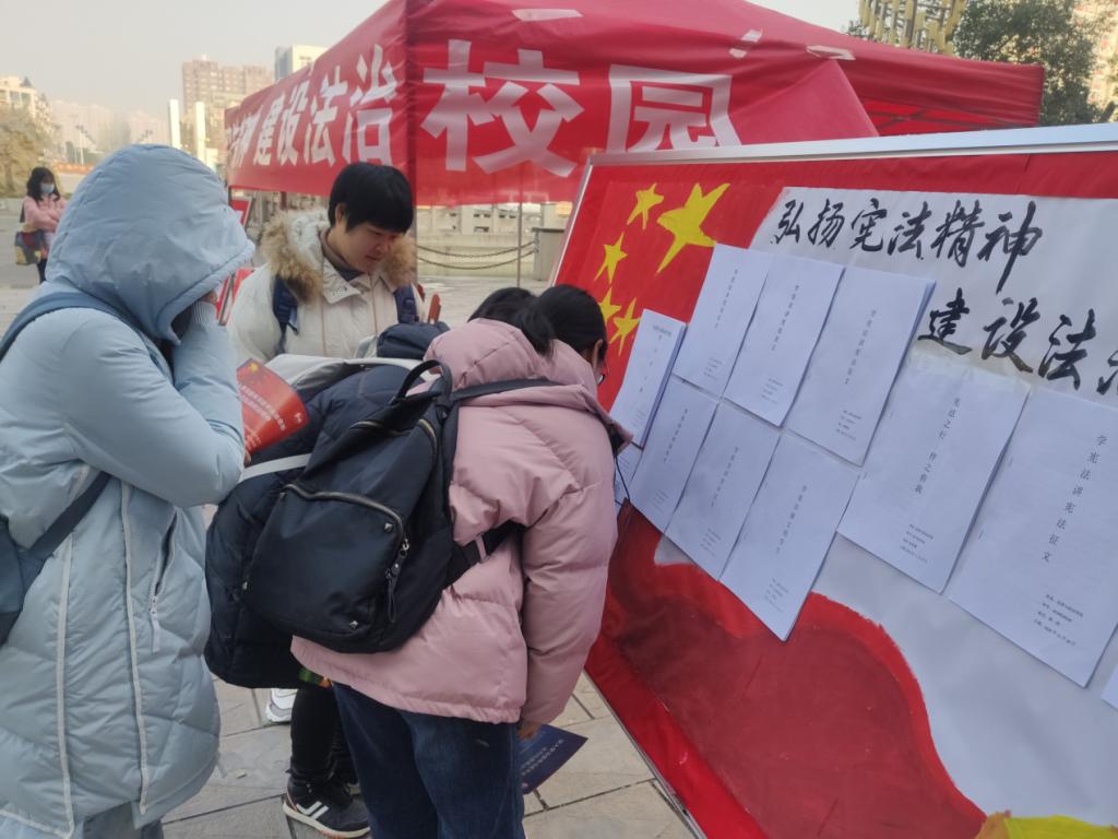 法學會和青年志愿者協會以懸掛憲法橫幅、擺放憲法宣傳展板、分發憲法宣傳單等方式向師生、群眾面對面宣傳憲法知識,共發放憲法宣傳資料5000余份。
