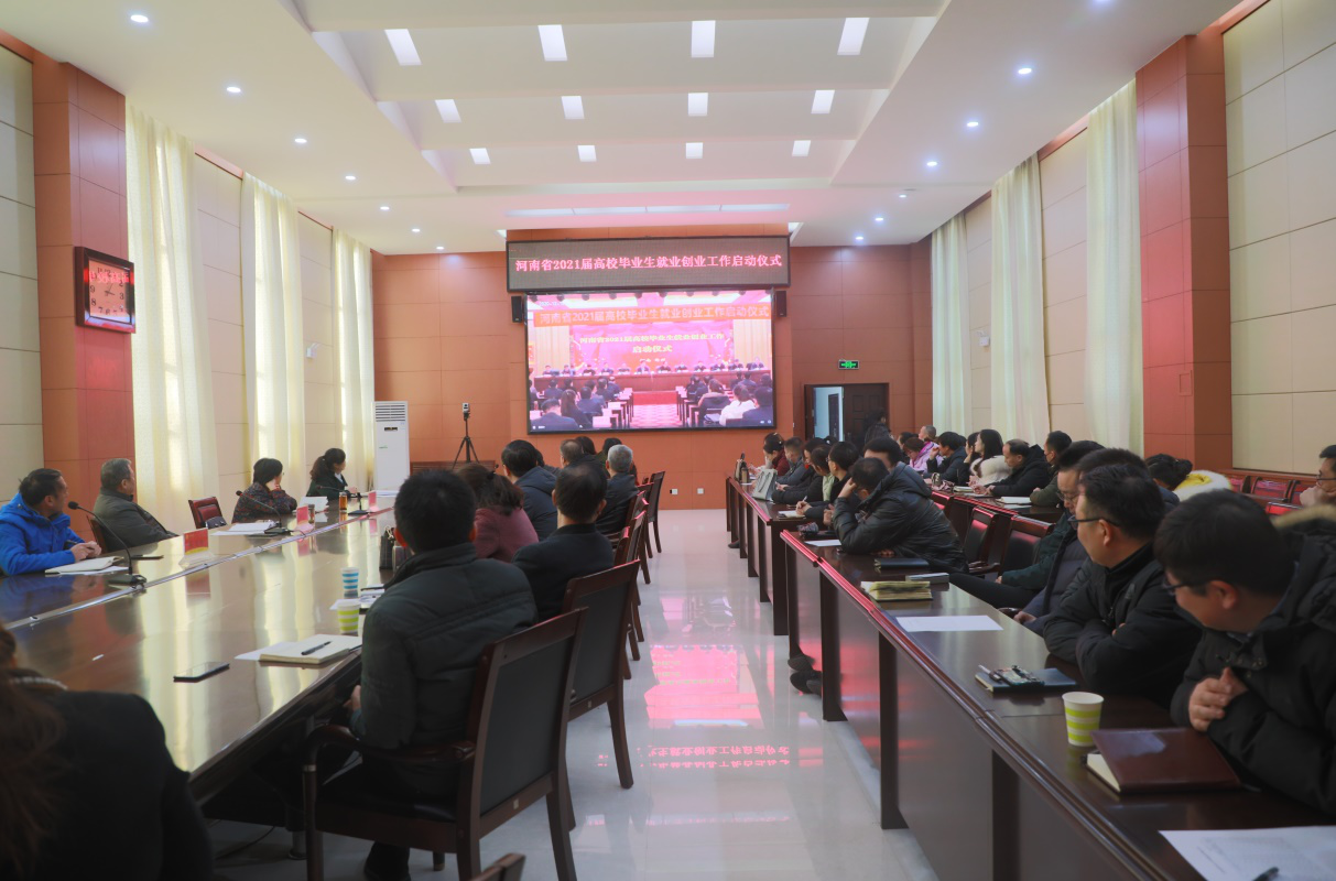 12月15日下午,在南校區行政樓201會議室,我校組織收看了河南省2021屆高校畢業生就業創業工作啟動儀式,參加會議的有校黨委副書記、校長鄭廣華,副校長霍曉麗,學校黨委委員、副校長吳玉倫,招生就業處、教務處、學生處等職能部門負責同志,各學院主要負責人和分管就業工作的負責人及全體畢業生輔導員。