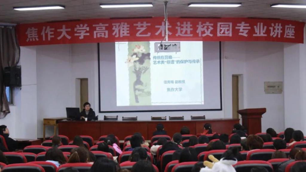 為進(jìn)一步推進(jìn)高雅藝術(shù)進(jìn)校園活動(dòng),豐富校園文化生活,提高師生藝術(shù)修養(yǎng),我校藝術(shù)學(xué)院于2020年12月25日下午在北校區(qū)現(xiàn)教中心報(bào)告廳,舉辦高雅藝術(shù)進(jìn)校園系列專題講座。本次講座由音樂(lè)表演教研室主任任秀梅副教授主講,內(nèi)容為藝術(shù)類“非物質(zhì)文化遺產(chǎn)”的保護(hù)與傳承。