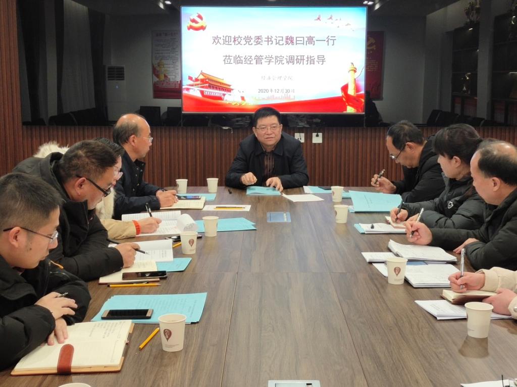 12月30日下午,校黨委書記魏曰高到經濟管理學院,以“黨支部、教研室作用發揮及教師轉型發展”為題進行調研。校黨委委員、黨政辦公室主任林五星、教務處處長林鄧偉、人事處處長霍霄艷、組織部科員胡草笛一同參加了調研活動。