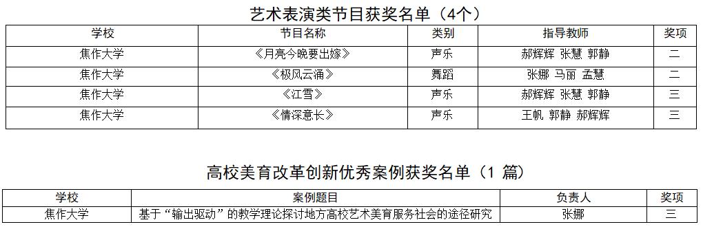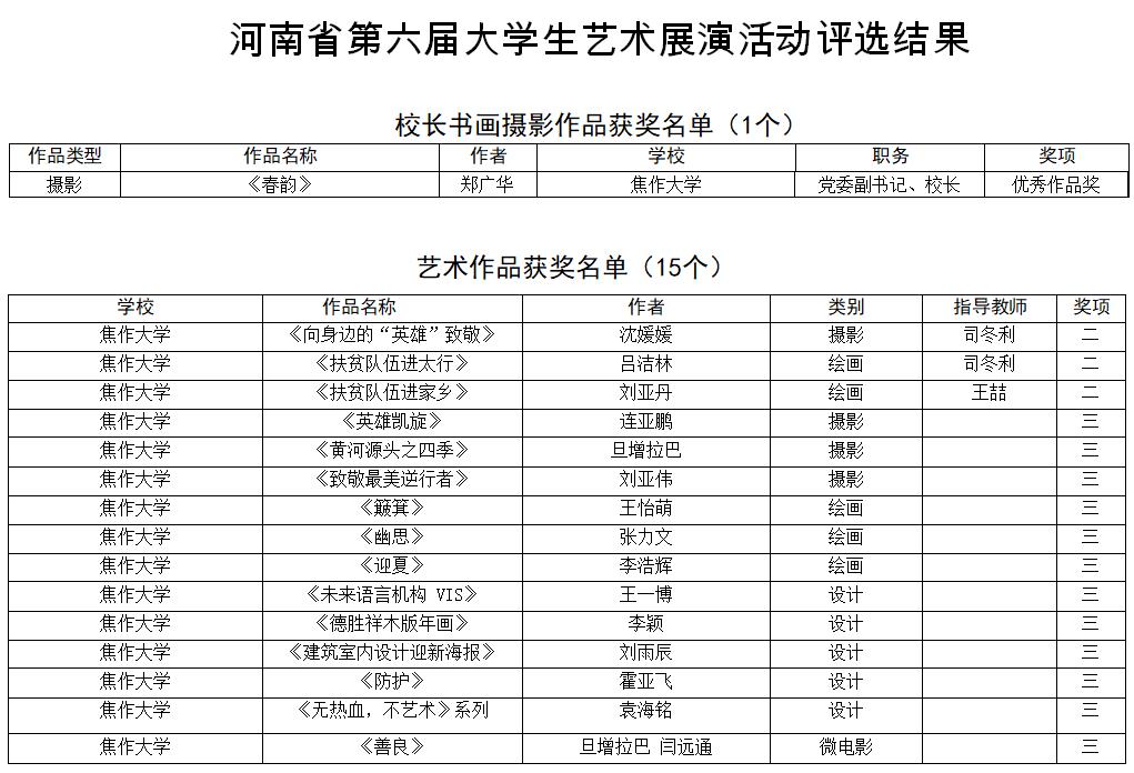 日前,由河南省教育廳主辦的河南省第六屆大學(xué)生藝術(shù)展演活動評選結(jié)果揭曉。經(jīng)過省活動組委會評審,我校在校長書畫攝影作品、藝術(shù)作品、藝術(shù)表演、高校美育改革創(chuàng)新優(yōu)秀案例四類比賽中分別取得了1個優(yōu)秀作品獎、5個二等獎、15個三等獎的優(yōu)異成績。