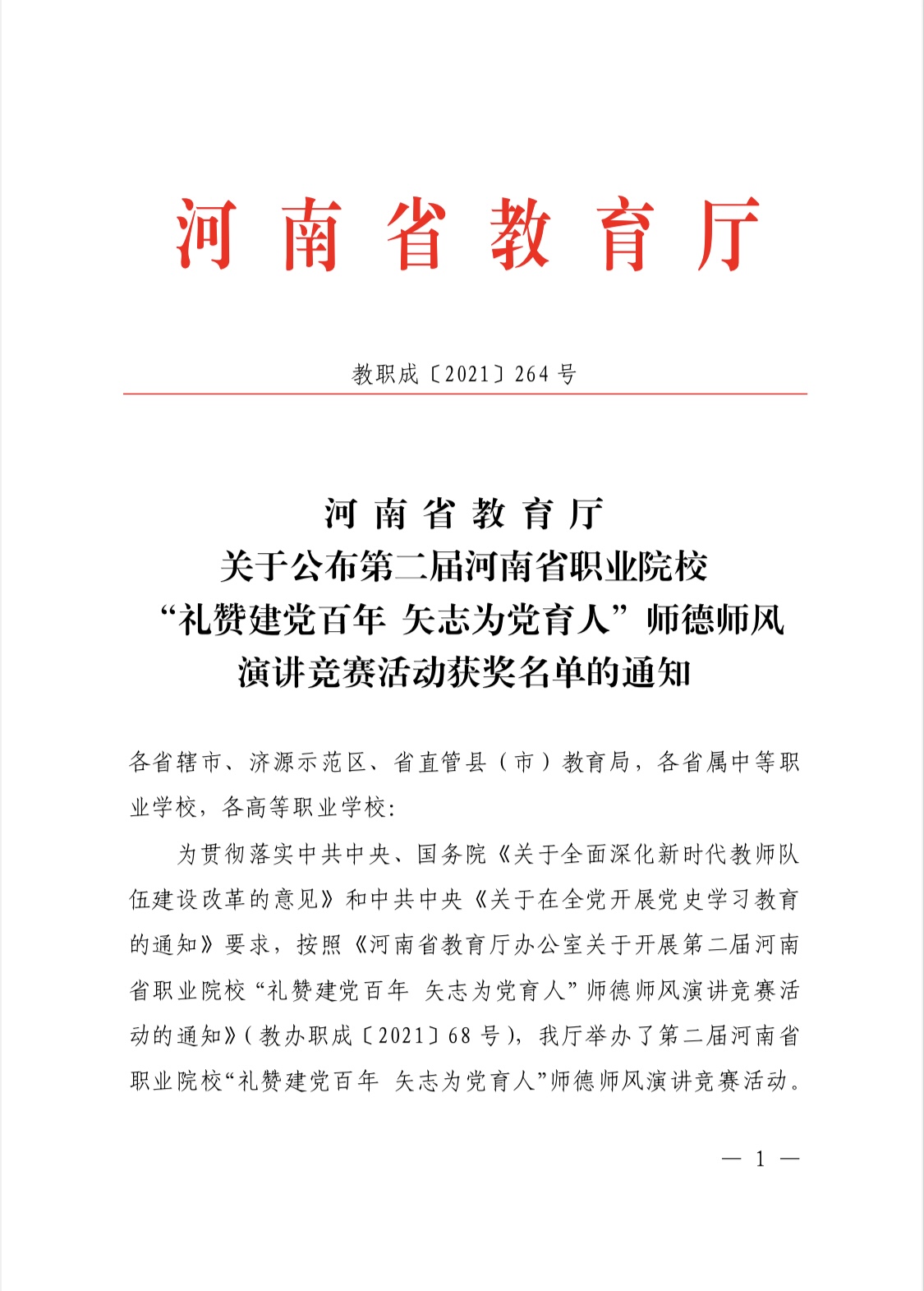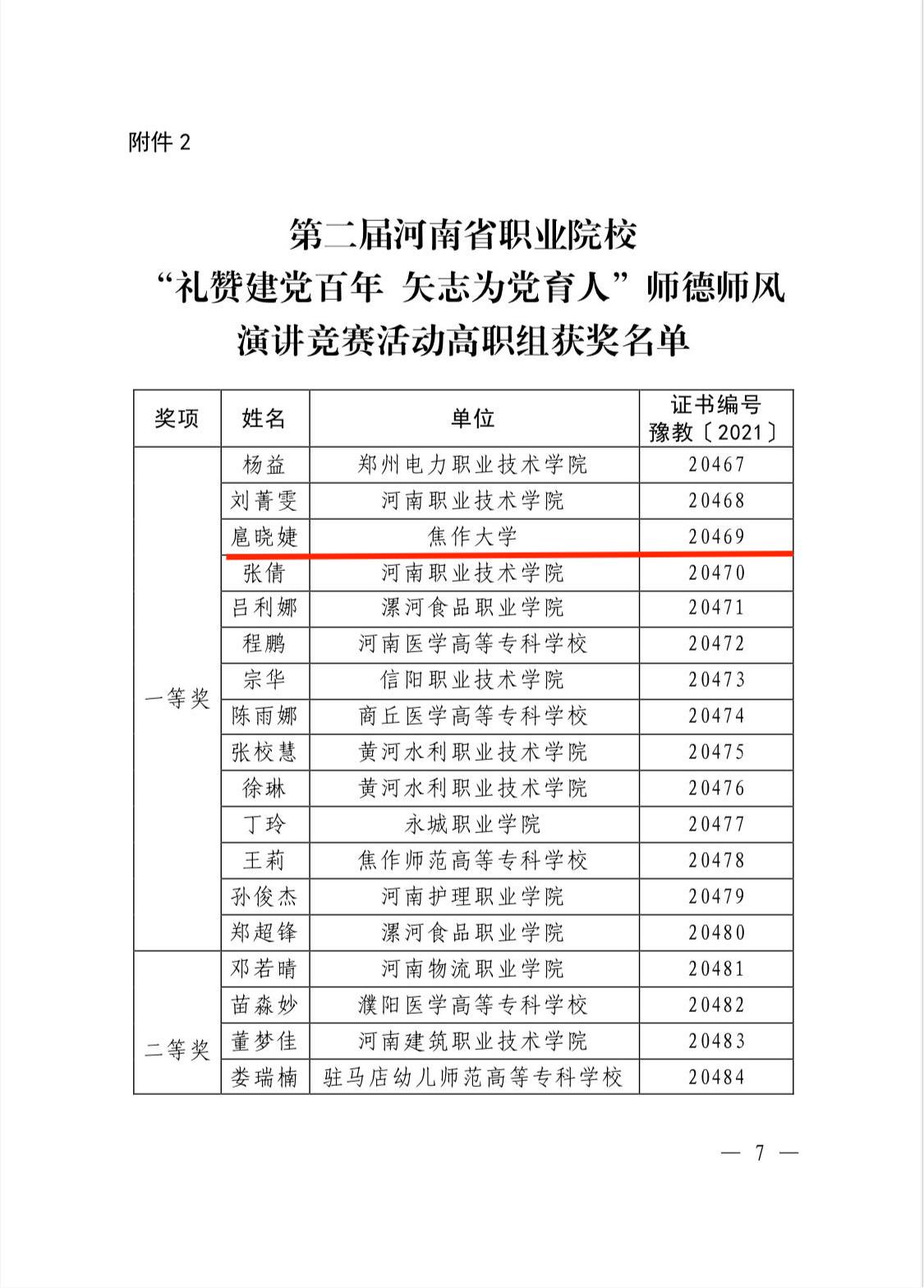 為貫徹落實中共中央、國務院《關于全面深化新時代教師隊伍建設改革的意見》和中共中央《關于在全黨開展黨史學習教育的通知》要求,河南省教育廳于近期開展了第二屆河南省職業院校“禮贊建黨百年 矢志為黨育人”師德師風演講競賽活動。我校人文學院教師扈曉婕獲得高職組一等獎,高婷婷獲得二等獎。