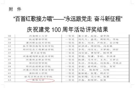 2021年7月,由河南省教育廳主辦、河南省教育廳關(guān)心下一代工作委員會協(xié)辦、鄭州師范學(xué)院承辦的“百首紅歌接力唱——永遠跟黨走 奮斗新征程”活動現(xiàn)場展演暨頒獎典禮在鄭州舉行。我校報送的作品《唱支新歌給黨聽》、《青春》在全省大中小學(xué)報送的200余件作品中脫穎而出,榮獲一等獎。