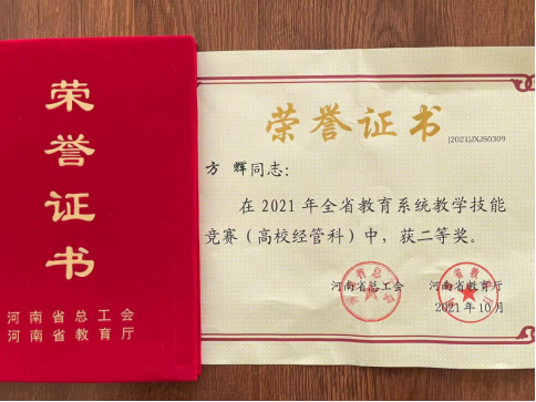 河南省總工會、河南省教育廳于2021年6月至10月在全省教育系統開展了高等院校思政、文科、理科、工科教學技能大賽。經過各級總工會、教學行政部門,高等院校工會、行政及有關單位的精心組織、嚴密實施,并由河南省教育系統教學技能競賽領導小組組織的評審委員會評比審定及現場決賽,我校閆麗華老師榮獲2021年全省教育系統教學技能競賽高校思政科一等獎、方輝老師榮獲高校經管科二等獎。