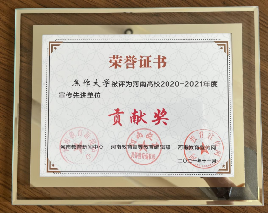 在河南教育新聞中心發(fā)布的《關(guān)于公布河南高校2020—2021年度宣傳先進單位、優(yōu)秀通訊員、優(yōu)秀新聞作品評選結(jié)果的通知》中,我校榮獲“河南高校2020-2021年度宣傳先進單位貢獻獎”,《焦作大學:以“五舉措、五結(jié)合、五個一”確保黨史學習教育取得實績》被評為河南高校2020-2021年度優(yōu)秀新聞作品一等獎,張哲同志被評為“河南高校2020-2021年度優(yōu)秀通訊員”。