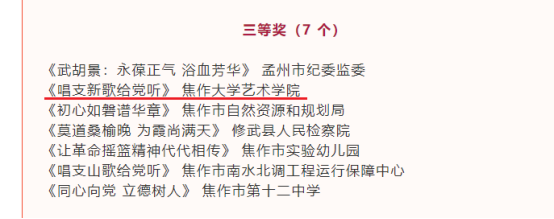 近日,由市委黨史學習教育領導小組主辦,市委宣傳部、焦作日報社承辦的焦作市“學黨史、悟思想、辦實事、開新局”主題微視頻大賽評選揭曉。我校藝術學院作品《唱支新歌給黨聽》榮獲三等獎。