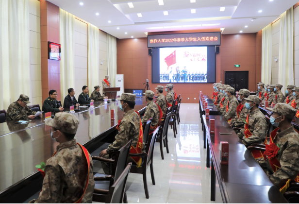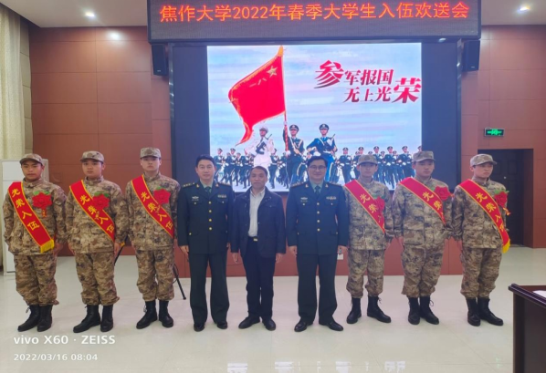 3月16日上午,我校2022年春季大學生入伍歡送大會在行政樓201會議室舉行。校黨委委員、副校長吳玉倫,山陽區武裝部政委華德強,山陽區武裝部部長黃應龍,校武裝部副部長劉典峰出席會議。會議由校武裝部部長李輝主持。