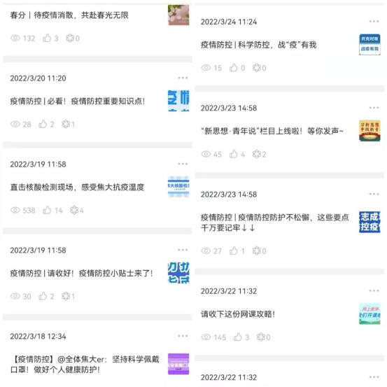 三是積極宣傳,加強引導。通過微信公眾號等新媒體平臺,積極轉發權威媒體網站疫情消息,推送防疫知識,引導廣大師生增強防護意識,科學做好防護。截至目前共發布疫情防控相關推文40余篇,營造了良好的輿論氛圍。各學院積極組織學生開展線上主題班會,傳達疫情防控知識,教育引導學生做好個人防護,同時引導學生自覺擔起社會責任,科學理性看待疫情,積極傳播正能量,彰顯新時代大學生的責任與擔當。