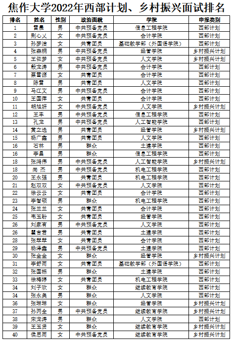 近期,校團委正在與上級部門積極溝通崗位分配相關事宜,按照以下排名擇優錄取,做好我校西部計劃志愿者崗位對接、體檢、崗前培訓等后續工作。