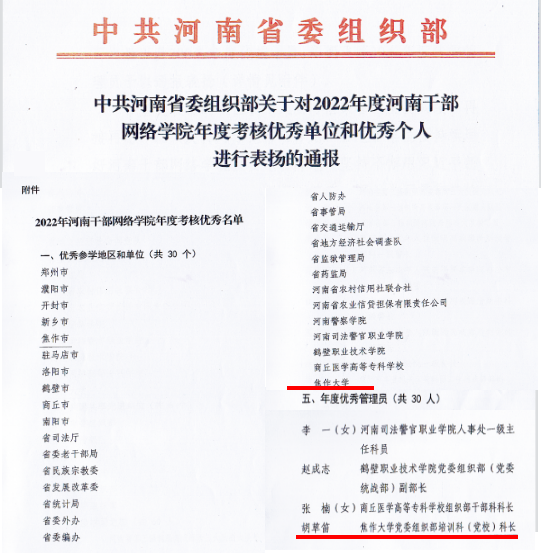 焦作大學(xué)榮獲河南干部網(wǎng)絡(luò)學(xué)院2022年度優(yōu)秀參學(xué)單位稱(chēng)號(hào)