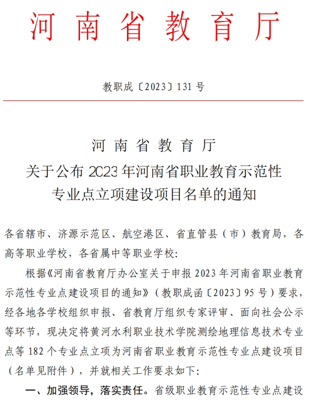 近日,河南省教育廳發布了《關于公布2023年河南省職業教育示范性專業點立項建設項目名單的通知》(教職成〔2023〕131號)我校申報的建筑工程技術專業獲批示范性傳統優勢專業點,申報的機電一體化技術專業獲批示范性骨干專業點。