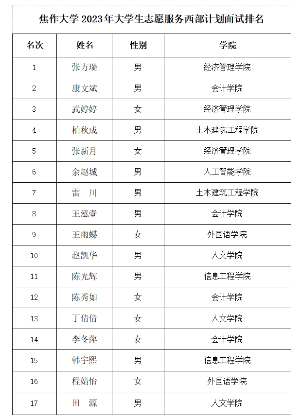 近期,校團委將積極與河南省西部計劃項目辦溝通崗位分配相關事宜,按照以下排名擇優錄取,做好我校西部計劃志愿者崗位對接、體檢、崗前培訓等后續工作。讓優秀的志愿者到西部去、到基層去、到祖國最需要的地方去,服務基層,奉獻青春。