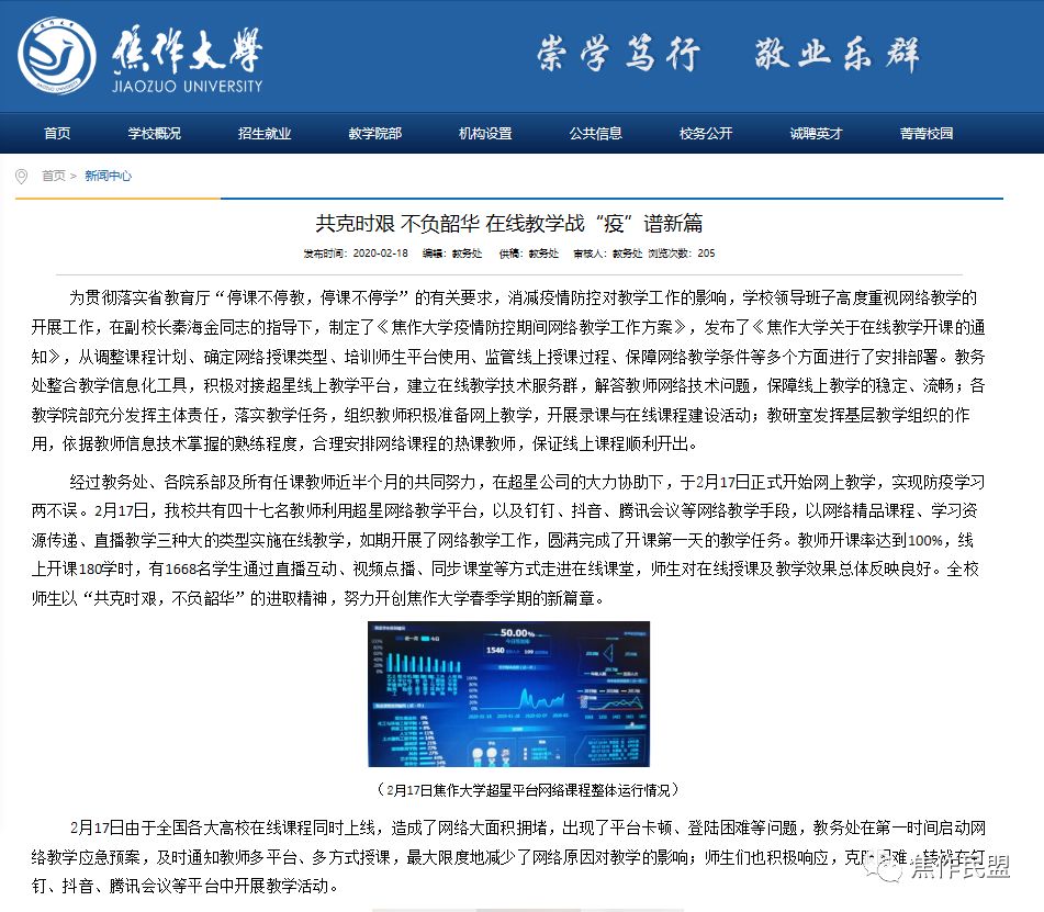 2020年03月10日,焦作日?qǐng)?bào)校園之聲以《抗擊疫情,民盟焦作大學(xué)支部成員在行動(dòng)!》為題,對(duì)民盟焦作大學(xué)支部盟員投入到網(wǎng)絡(luò)教學(xué)“戰(zhàn)線”,勇?lián)W(wǎng)絡(luò)教學(xué)重?fù)?dān)的事跡進(jìn)行了報(bào)道。內(nèi)容如下: