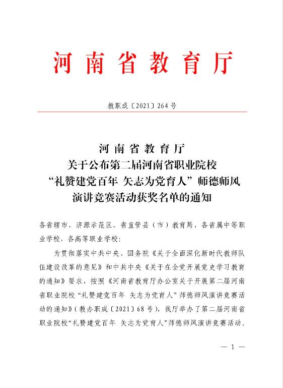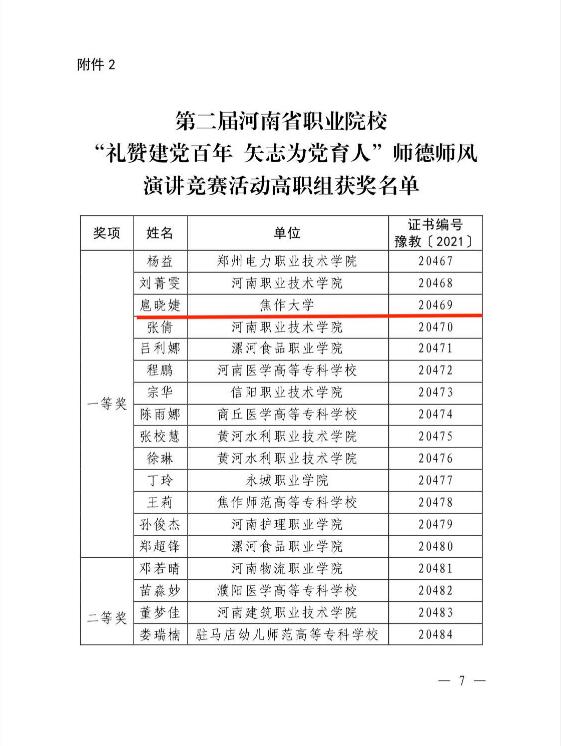 大河網訊 河南省教育廳近期開展了第二屆河南省職業院校“禮贊建黨百年 矢志為黨育人”師德師風演講競賽活動。焦作大學人文學院教師扈曉婕獲得高職組一等獎,高婷婷獲得二等獎。